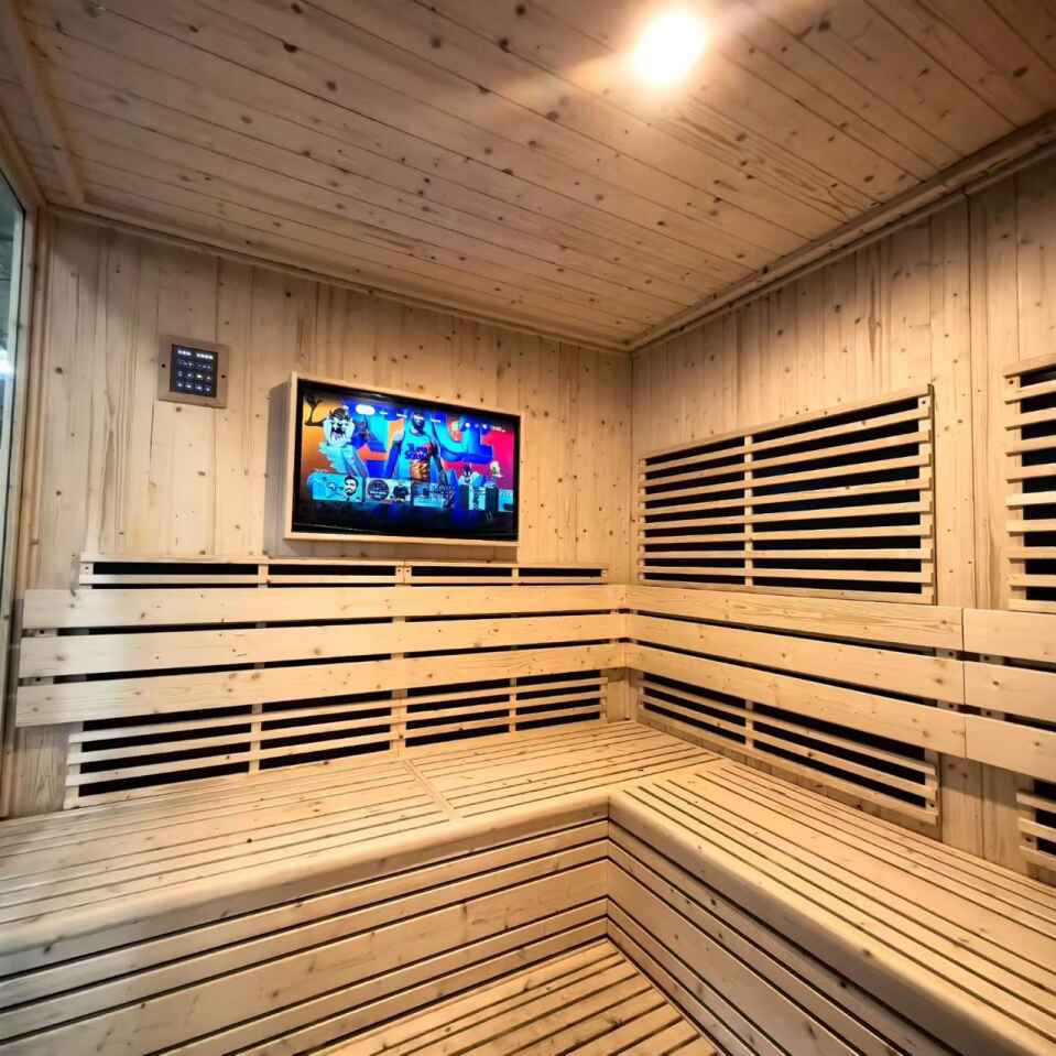 Η ενσωματωμένη τηλεόραση LCD (ορατή στην εικόνα) μεταμορφώνει την εμπειρία της σάουνας: