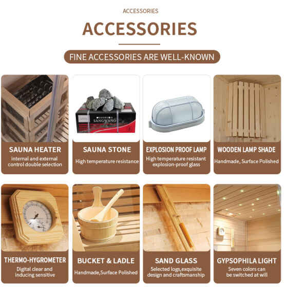 Αξεσουάρ παρακολούθησης και εμπειρίας: Ευαίσθητο μετρητή θερμοκρασίας και υγρασίας, χρονόμετρο άμμου κορμού (χρονομέτρηση + τελετουργική αίσθηση), γυαλισμένο στο χέρι ξύλινο κουβά και κουτάλα, αποκαθιστώντας την παραδοσιακή τελετουργική αίσθηση της σάουνας, εξασφαλίζοντας ταυτόχρονα άνετη χρήση τουΕξωτερική γυάλινη πόρτα υπαίθριο ατμόλουτρο.