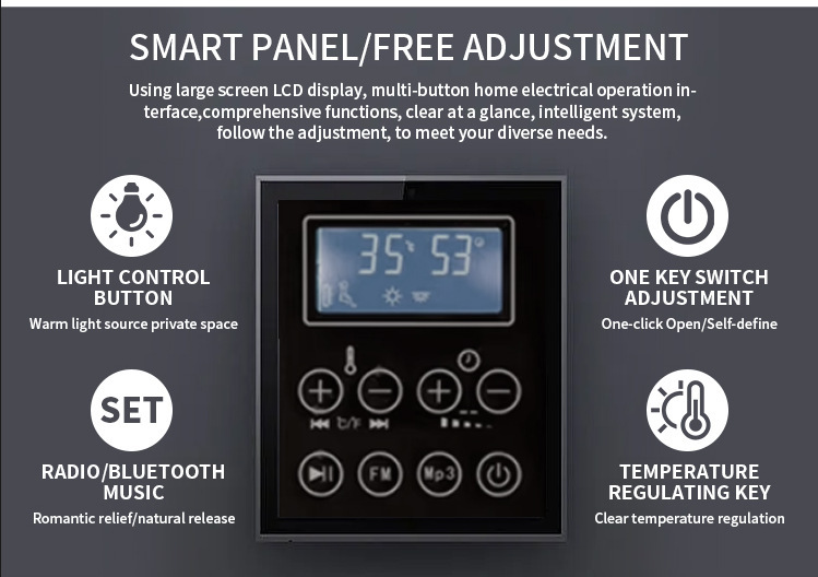 ΟΕξωτερική γυάλινη πόρτα υπαίθριο ατμόλουτροείναι εξοπλισμένο με έναν ευφυή πίνακα ελέγχου LCD μεγάλου μεγέθους ειδικά για εξωτερικούς χώρους (αδιάβροχη και αδιάβροχη σχεδίαση), πραγματοποιώντας βολική λειτουργία "έλεγχος με ένα κλειδί":